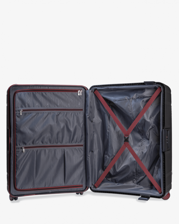 - A l’intérieur double séparation : un jeu de sangles croisées et trois compartiments zippés